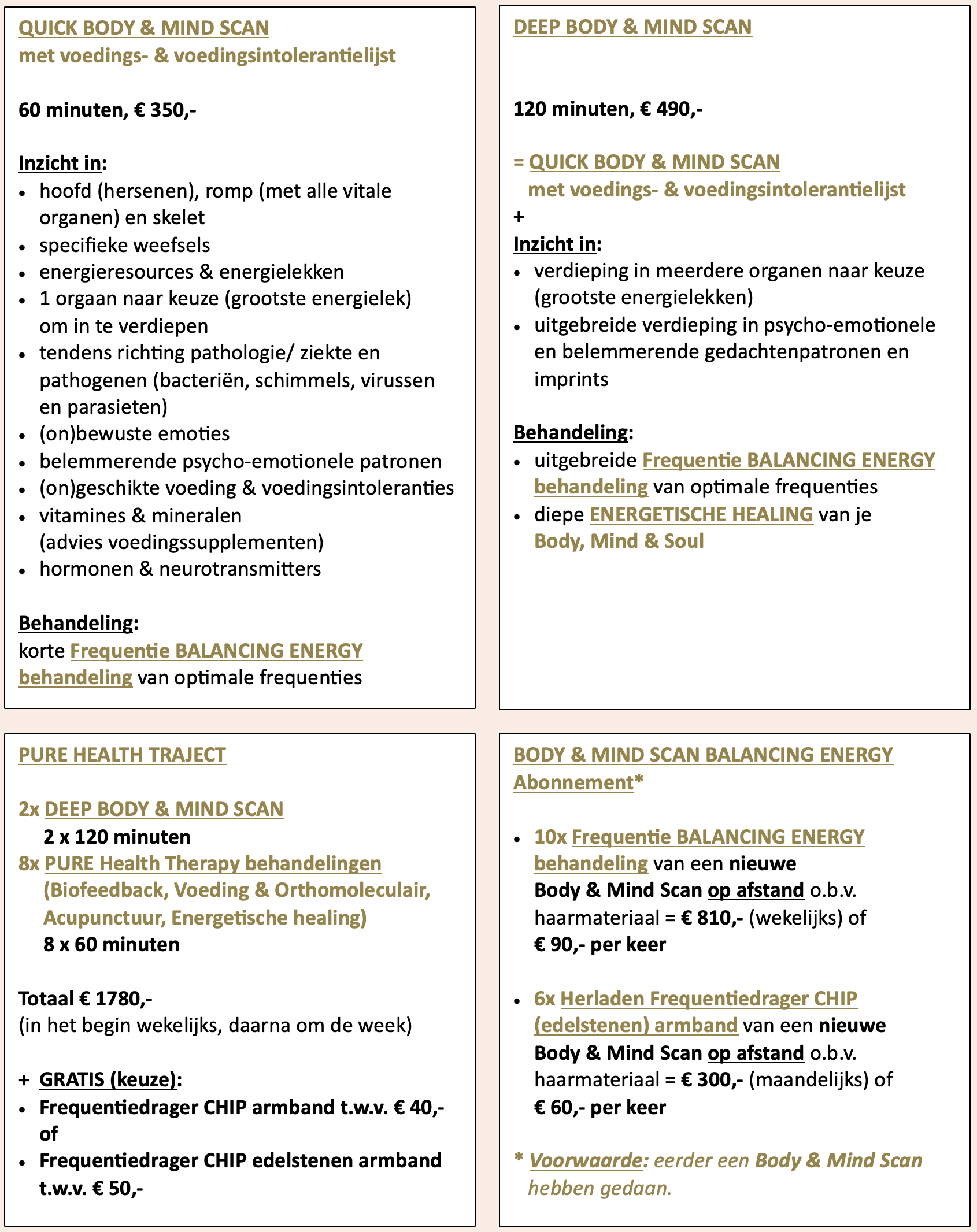 Je kunt kiezen voor een losse Quick Body & Mind Scan waarbij je ook de voedingslijst ontvangt tot aan een hele uitgebreide Deep Body & Mind Scan waarbij we diepe psycho- emotionele patronen inzichtelijk maken.
